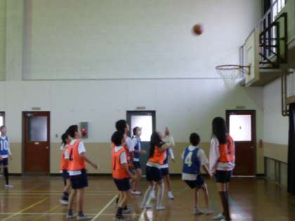 6年生は体育でバスケットボールをしています。お互いに声をかけ合いながら,ボールをつないでゴールまで運びます。きびきびした動きは,さすが6年生です。