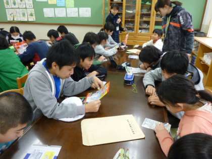 6年生が栄養教諭の山本先生から食の指導を受けています。今日のテーマは「食品添加物について知ろう」。様々な食品のパッケージを調べて,どんな表示がされているかを確かめています。