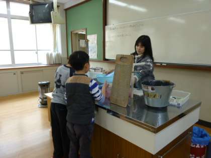 3年生は,社会科の学習で「昔の道具」体験をしています。今日は家庭科室で,洗濯板を使ってぞうきんを洗ってみました。ぞうきんはきれいになったかな?
