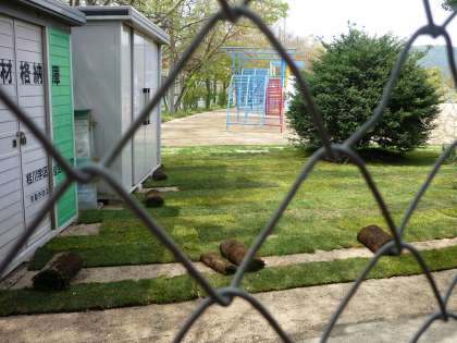 運動場の芝生化の工事が進み,芝生がはられ始めました。