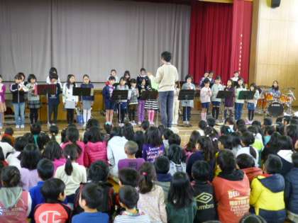 今日は1年の締めくくりとして,桂川小学校のみんなの前で音楽を聴かせてくれました。この演奏を聴いている子どもたちの中から,きっと来年度ミュージックサークルに入部する子も出てくることでしょう。
