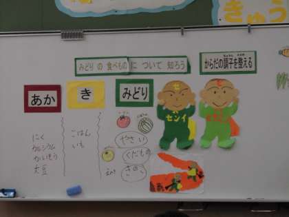 今日は,「みどりの食べ物について知ろう」というめあてで学習しました。みどりの食べ物には,野菜・果物・きのこがあること,食物繊維やビタミンが豊富で,体の調子を整えることを学びました。