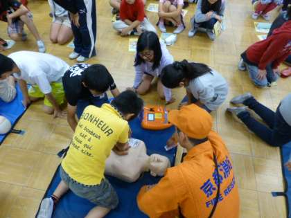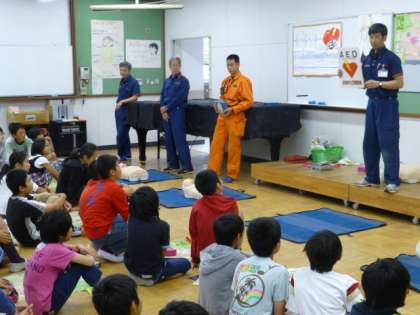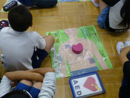 桂川小学校では毎年,6年生を対象に「救命入門コース」を実施しています。消防署の方ら,実際に倒れている人を見かけたらという想定で,胸骨圧迫の仕方やAEDの使い方を教えていただきました。