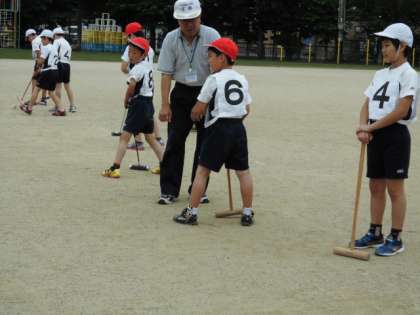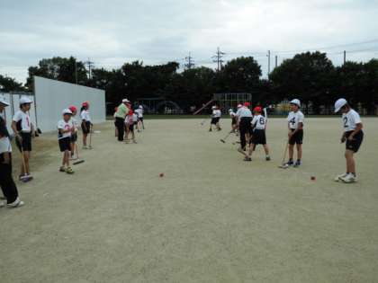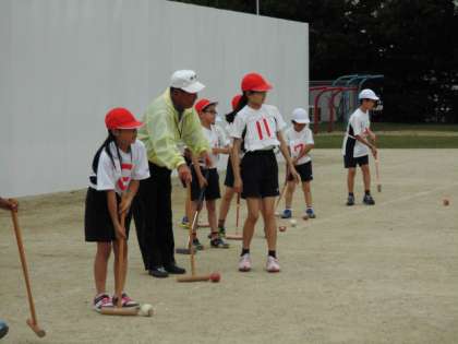 ゲートボールクラブは地域のゲートボールクラブの方に指導していただいています。今日は,初めてボールを打つ練習をしました。まっすぐに打つのはなかなか難しいですが,子どもたちは,楽しんで練習していました。