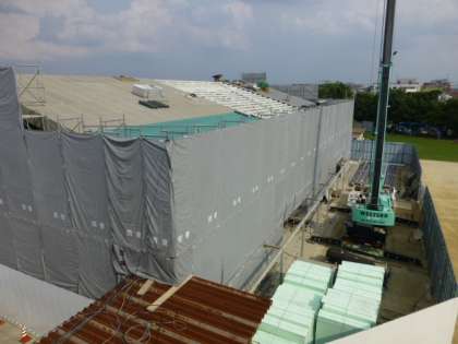 改修工事の進んでいる体育館ですが,大きなクレーン車が入り,いよいよ屋根の解体作業が始まりました。