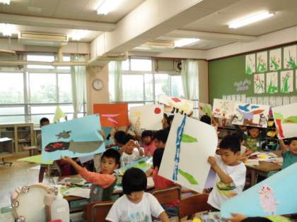 図画工作科で1年生は,色々な紙を破いて,その形を何かに見立てて画用紙に貼っていきました。紙から,いろいろなものが生まれました。