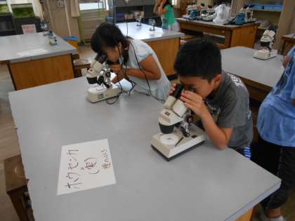 昼休みに、理科室でミニ科学タイムがありました。顕微鏡で、アサガオやホウセンカ、ホトケノザなどを見ると、花粉が見えたり短い毛が見えたりと、いつもとちがって見えました。