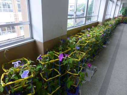 一人一人が大切に育てているアサガオ(1年生),ミニトマト(2年生),ホウセンカ(3年生),イネ(5年生)も台風を避けて校舎内に避難しています。