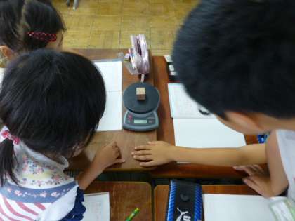 「同じ大きさでものの種類がかわると重さはどうなるか」というめあてに対して,予想を立て,実際に重さを量ってみました。さて,結果はどうなったでしょうか?