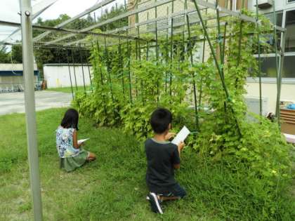 4年生の夏休みの宿題には,「ツルレイシのかんさつ」があります。今日も子どもたちがやって来て,観察カードを書いていました。