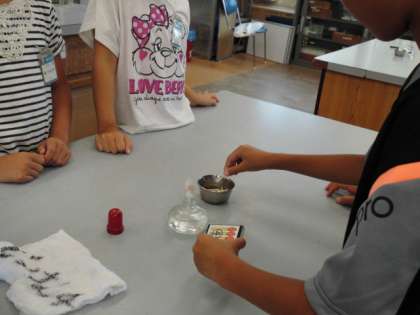安全のために場を設定し.まずはマッチを擦ります。これがなかなかです。こわごわマッチを動かすのでなかなかつかず・・・。それでも何度もチャレンジすると,火がつき,アルコールランプに火が点りました。
