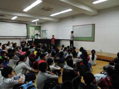 傘をさして登校してきた子どもたち。音楽室での出発式となりました。わくわくどきどき,少し緊張気味の5年生。