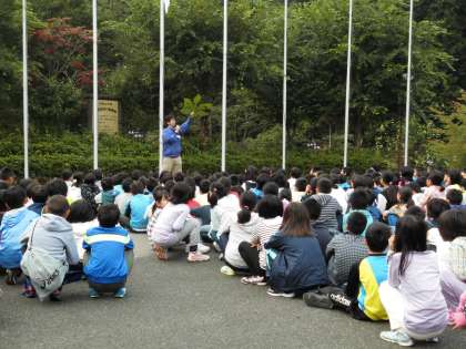 雨も上がり,時々青空が見える爽やかな朝です。玄関前広場で,合同の朝の集いをしました。