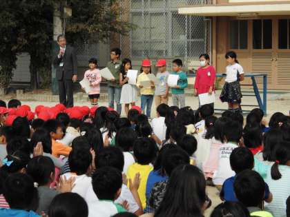 また,登校時,とてもすてきなあいさつをしている登校班の紹介がありました。全校の前で,校長先生から,賞状を頂きました。
