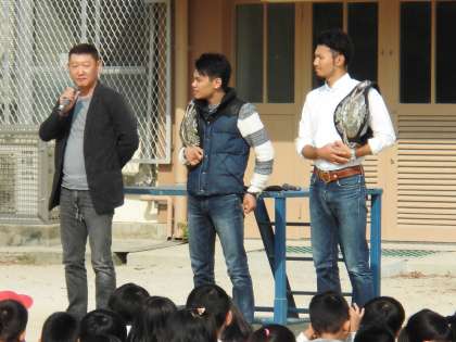 校区にあるボクシングジムの2選手に学校に来ていただきました。