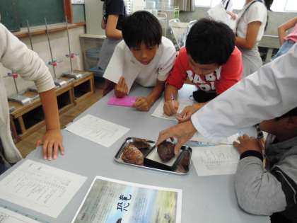 アンモナイトやマンモスの歯,恐竜のふんや卵などの化石を実際に見て記録しました。