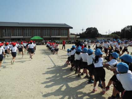 本校運動会の特色のひとつが,きょうだい学年種目です。異学年の子どもたちが力を合わせてがんばります。先に綱を引いている1年生を,後から追いかけてきた4年生が加勢します。1年生にとって,4年生がとても頼もしく思えます。