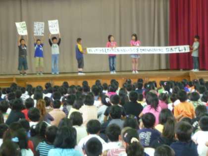 まず,フレンドリーグループで顔合わせをしてから,体育館に集まって,児童集会をしました。