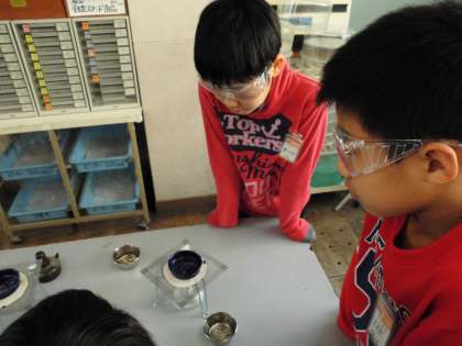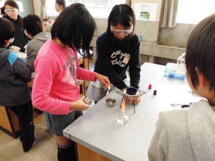 5年「もののとけ方」の実験もいよいよ最後です。ろ過したろ液に、まだホウ酸がとけているのか確かめるため、アルコールランプで熱して蒸発させてみました。ホウ酸の粒が結構たくさんでてきてびっくりしました。
