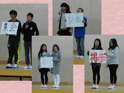 今年度最後の児童集会では,各委員会からのお知らせを行いました。この1年間のそれぞれの委員会の活動の様子と,みんなへのお知らせを代表が発表しました。