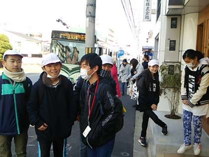 いいお天気の中,6年生は小学校生活最後の校外学習です。社会科で学習した歴史的建造物を訪ねて,グループで京都市内を回っています。自分たちでコースを考え,移動方法も調べての出発です。