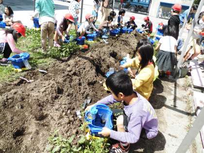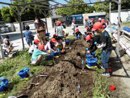2年生はミニトマトの苗を植えました。自分で植木鉢に土を入れ,苗を一つずつもらって植木鉢に植えました。おいしいトマトができるかな。