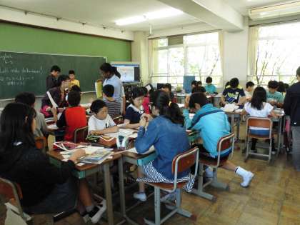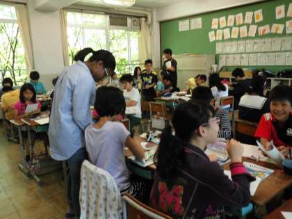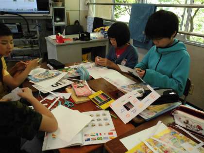 ALTのジェームズ・ステーシー・アンとの英語活動を行いました。小文字のアルファベットを使っての辞書作りをしました。5年生の時は大文字を学習しましたが,6年生になって,小文字も加わりました。