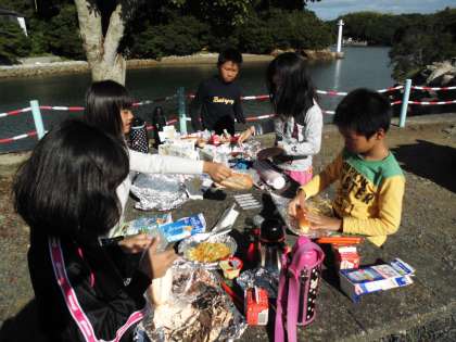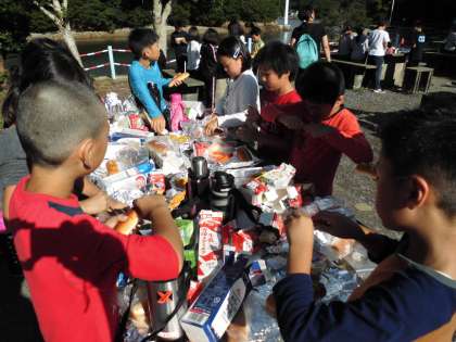朝ご飯は,野外炊事場でのパックドッグ作りです。自分でキャベツ炒めとウインナーをパンにはさみ,ホイルに包んで牛乳パックに詰めました。火をつけて,牛乳パックが燃えきったらできあがりです。