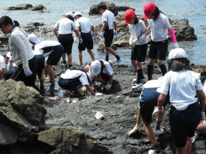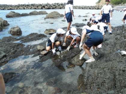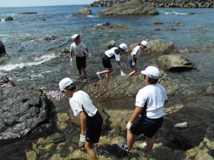 昨日よりさわやかなお天気です。磯観察に出発です。朝陽が当たった海はエメラルドに輝いています。わくわくわく・・・・。