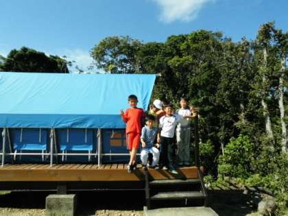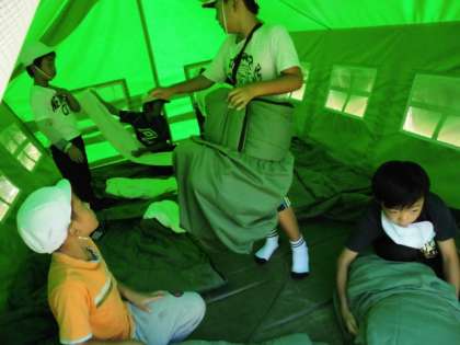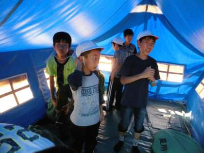 今夜の寝場所は男子がテントです。今から寝具準備です。テントの中は,ものすごく暑いです。でもこれが,夜になると涼しくて寝やすい寝床になります。