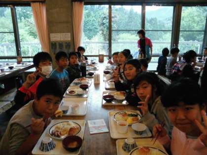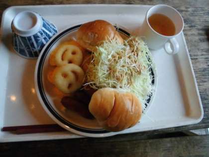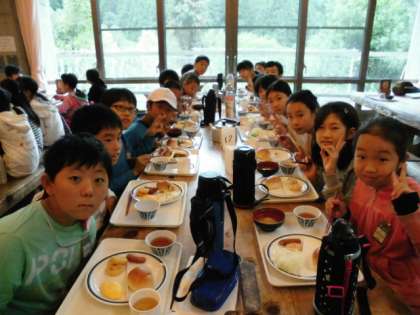 朝ごはんです。山の家初めての食堂です。朝は,コーンスープか味噌汁を選びました。ご飯とパンは,自由に食べられます。