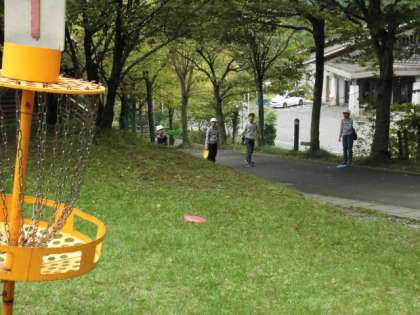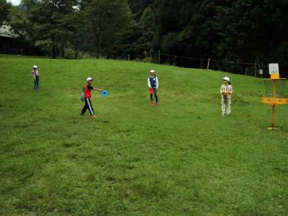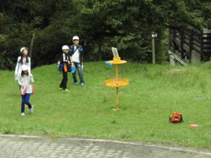 フライングディスクゴルフは,丸いディスクをバスケットめがけて投げ,何度で入るかを競います。なかなか思う方向に飛びませんが,グループで楽しんでいました。