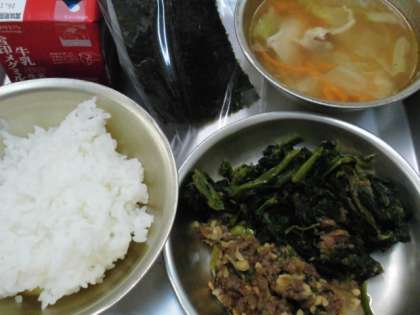 ごはん・ほうれん草のおかか煮・肉みそ納豆・手巻きのり・キャベツの吉野汁・牛乳です。学校中,納豆の香りが漂っています。肉みそ納豆は人気のメニューです。