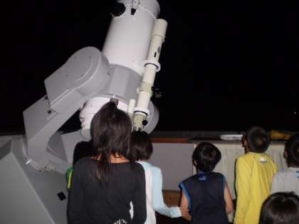夕方の突然の雷雨。子どもたちは「今晩の天体観測は中止?」と心配そうでしたが,夜になり,美しい星空が現れました。午後8時頃から学級ごとに天文台で「天体観測」を楽しみました。「夏の大三角」「北斗七星」「カシオペヤ」とよく知っている星々も,山の家では見え方がちがいます。大きな望遠鏡では星団や二重星なども観望し,星に感動の夜になりました。