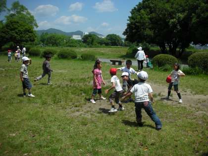 公園へ着くと、そこには松尾小学校の1年生もおり、一緒に楽しく遊ぶことができました。