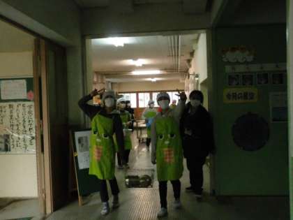 今日の6年1組の給食当番は,「ガチャピンズ」。