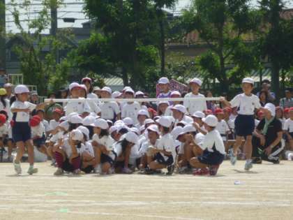 棒を足の下や頭の上を通す時のタイミングが,大きく勝敗を分けます。練習のときから,2年生と5年生が声を掛け合ってやってきました。その成果やいかに。