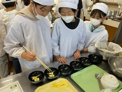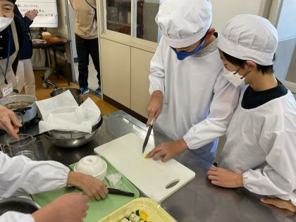 また、ゆずの皮の飾り切りの仕方も教えていただき、子どもたちは挑戦しました。