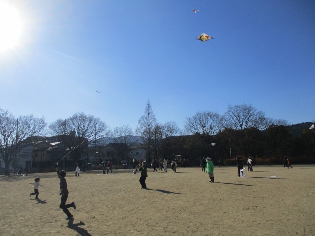 1月12日(月・祝)に上桂公園で、地域の方々が「たこあげ大会」を開いてくださいました。1年生は昔の遊びの体験として全員がたこ作りに取り組みました。そのたこを持って参加している1年生が多くいました。他の学年の児童も自分のたこを持って参加し、雲一つない青空に思い思いにたこをあげていました。参加した児童は普段なかなかできない体験に、元気いっぱい取り組んでいました。