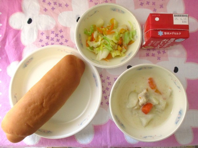 今日の献立は、ミルクコッペパン、じゃがいものクリームシチュー、野菜のソテー、牛乳でした。