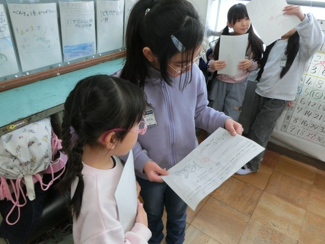 どんなロボットなのか、どんな時に助けてくれるのかを考えて、自分の考えたロボットを紹介し合いました。
