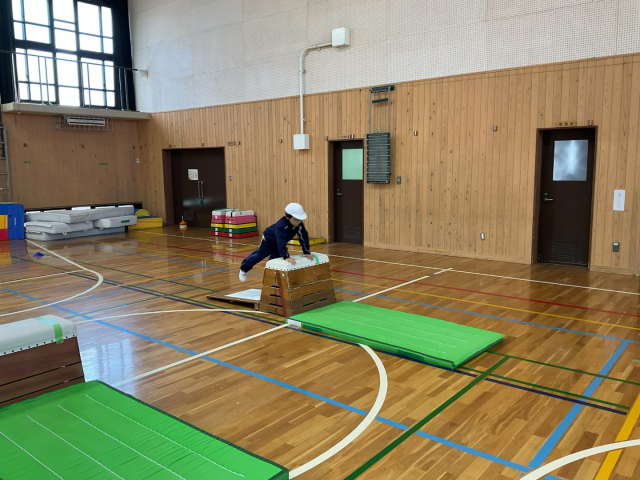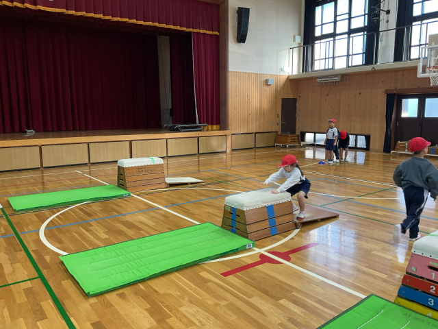 子どもたちは何度も跳び箱に向かい、自分なりに工夫しながら取り組んでいます。その姿から、少しずつ自信をつけている様子が見られます。