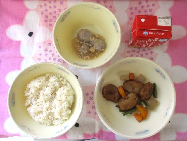 今日の献立は、麦ごはん、平天の煮つけ、揚げ里いものあんかけ、牛乳でした。