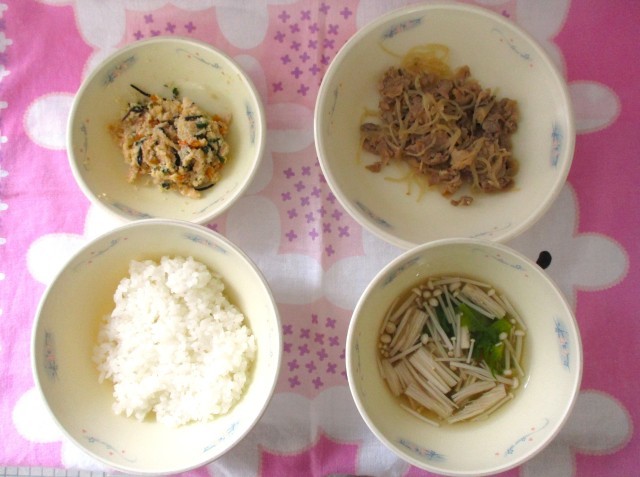 今日の献立は、ごはん、豚肉とこんにゃくのいため煮、おから、花菜のすまし汁でした。
