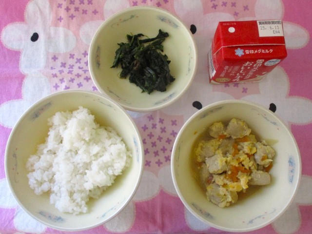 今日の献立は、ごはん、高野どうふの卵とじ、ほうれん草のおかか煮、牛乳でした。