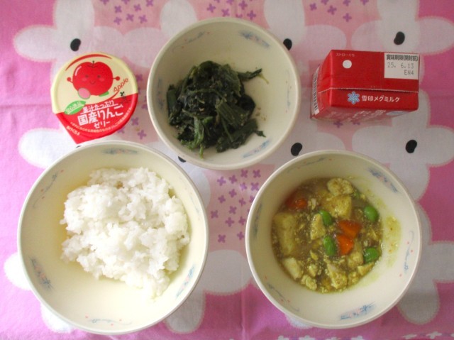 今日の献立は、ごはん、和風カレーどうふ、ほうれん草のごま煮、りんごゼリー、牛乳でした。