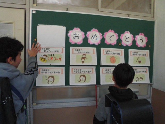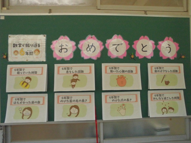 3月の保健室前掲示は「数字で振り返る6年間」です。
