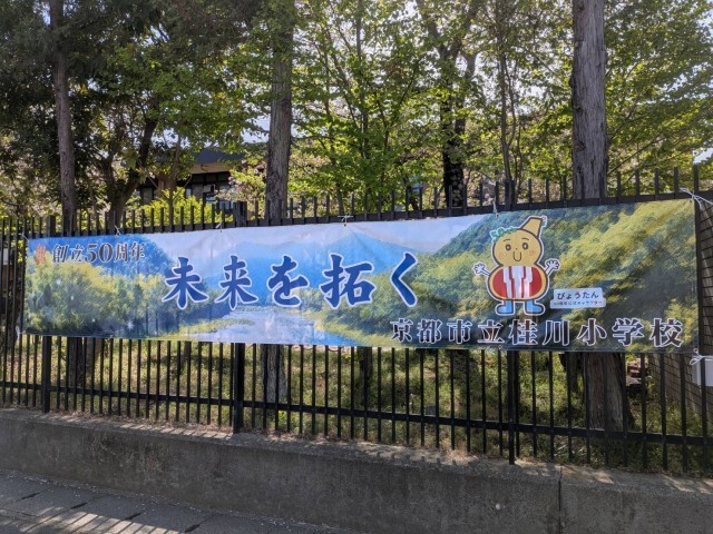 桂川小学校は、令和8年度に開校50周年を迎えます。つきましては、記念垂れ幕を正門付近に掲げています。50年間の「よき伝統」を未来に引き継いでいこうと教職員一同、今年度も精進していく所存でございます。どうぞよろしくお願い申し上げます。