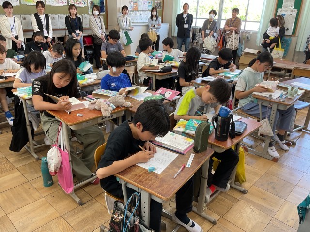 参観では国語の漢字の学習を見ていただき、漢字には同じ部分をもつと音も共通することがあるということに気づき、最後には自分で漢字クイズを作りました。