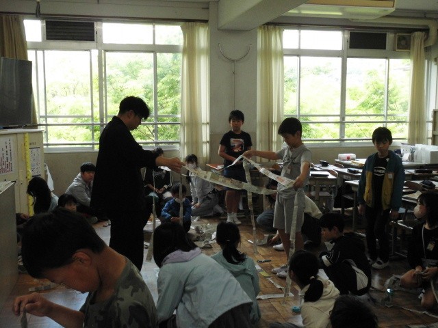 5年生 算数の学習では、体積の学習をしています。1立方メートル(1㎥)っていったいどれぐらいの大きさなのだろうと、新聞紙を1mの長さにして、それを使って、大きさを確かめていました。サイズ感がよくわかったのではないかと思います。